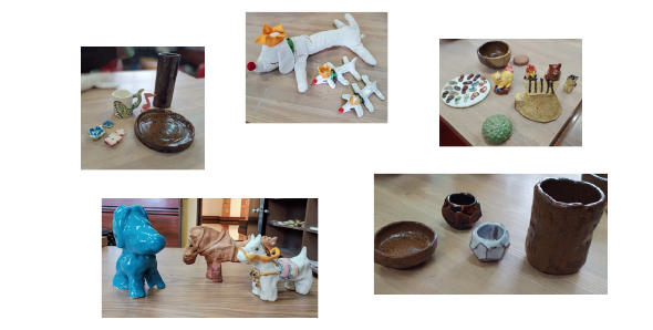 火曜午後の陶芸プログラムでは、先生に教わりながら思い思いの作品作りをしています。思い通りの形にすることもそうですが、釉薬は焼きあがるまではどんな感じに仕上がるかがわからないため難しいです。作品が完成した時はみんなで鑑賞しながらおしゃべりで盛り上がります。